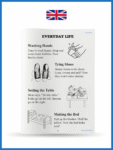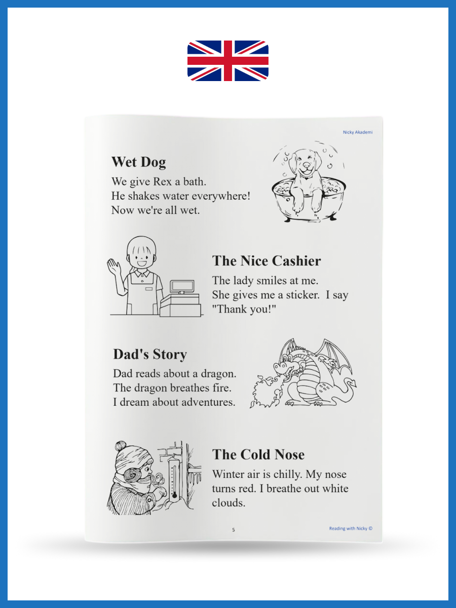 – Seviye 1: Sayfa başına 4-5 küçük hikaye (her biri sadece 2-3 cümle!) + boyamak için eğlenceli bir illüstrasyon.